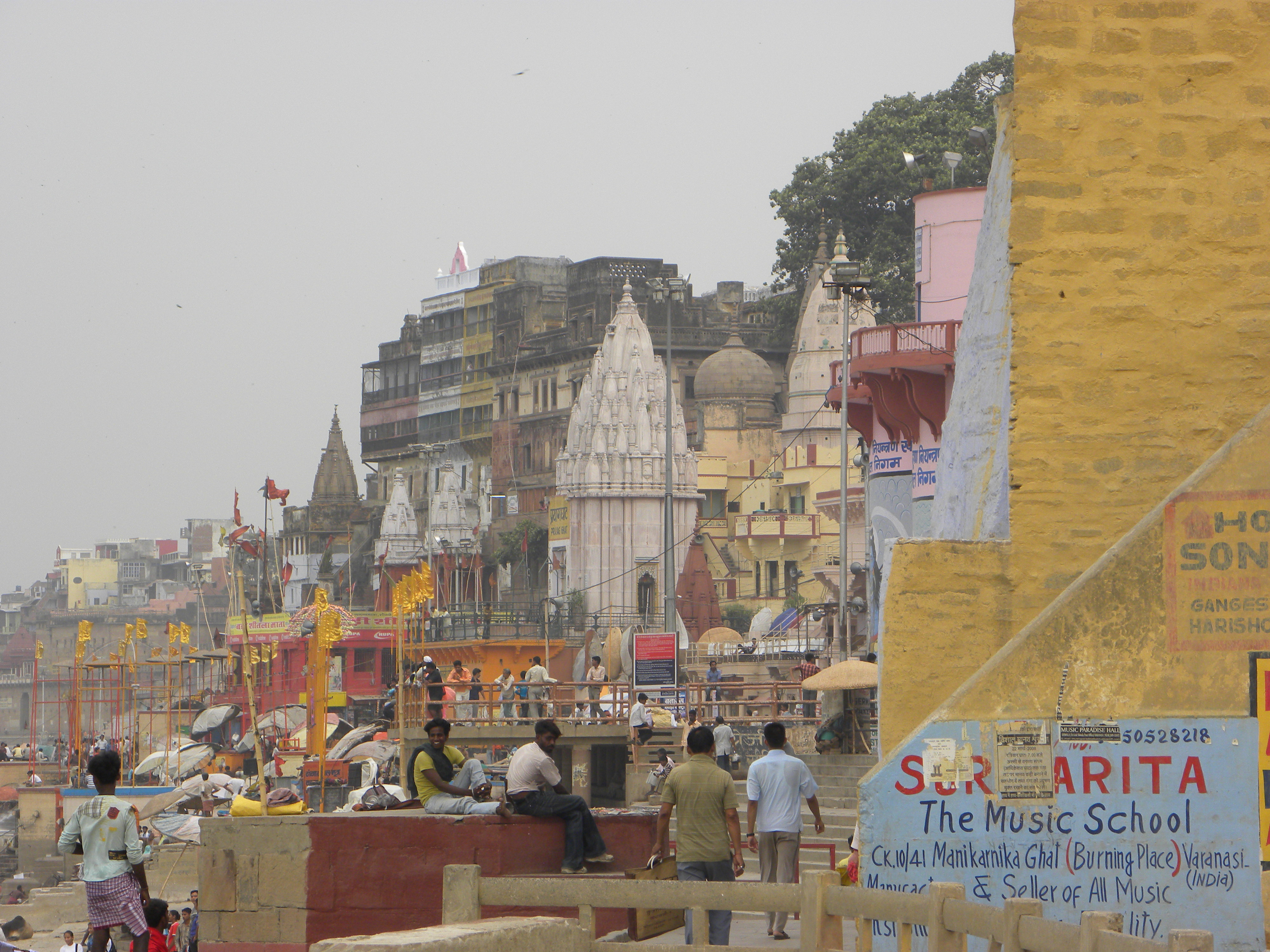 The Dhamekha Stupa itself dates back to about 500 AD and was built over an earlier stupa that Ashoka had built upon his visit to Sarnath in the mid-3rd century. Ashoka had also erected an exquisite 4-headed lion capital that crowned a tall pillar he had placed in Sarnath to commemorate his visit. This lion capital was struck by lighting and had fallen to the ground intact. It was now housed in the Sarnath Museum which was around the corner from the park. The capital was epic in scope and purpose. 4 lions placed back-to-back-to-back-to-back and other animals like an elephant, bull, and horse spaced below them. A large wheel of the Dharma was thought to have been built over the head of the lions, but that wheel has been lost. Below the paws of each lion appeared to be another wheel design of some sort. It looked like a wheel of a chariot, but I thought it could have been a rendering of the wheel of the Dharma. This lion capital is now the emblem that is set smack dab in the center of the national flag of India. So, the Buddhist emperor, Ashoka, had left a legacy that went beyond just making his own pilgrimages to the key places of the Buddhist’s life. In his quest to memorialize these visits, he created a symbol for a new country which more than 2000 years later would seek to gain independence and forge its own identity and nationhood. One could see the hand of the Sangha behind this legacy. Because again, the lion capital would never have made it through the marauding and colonial plundering that depleted much of the old Mauryan dynasty of Ashoka without the watchful eyes of the Sangha. Like Sanghamitta’s act to salvage the Bodhi Tree, I was able to see the Lion Capital at the Sarnath Museum because of the Sangha’s dogged preservation of this important relic. As I returned back to Varanasi, I mentally prepared for the next day where I was determined to make the walk to Manikarnika Ghat and into the beyond.