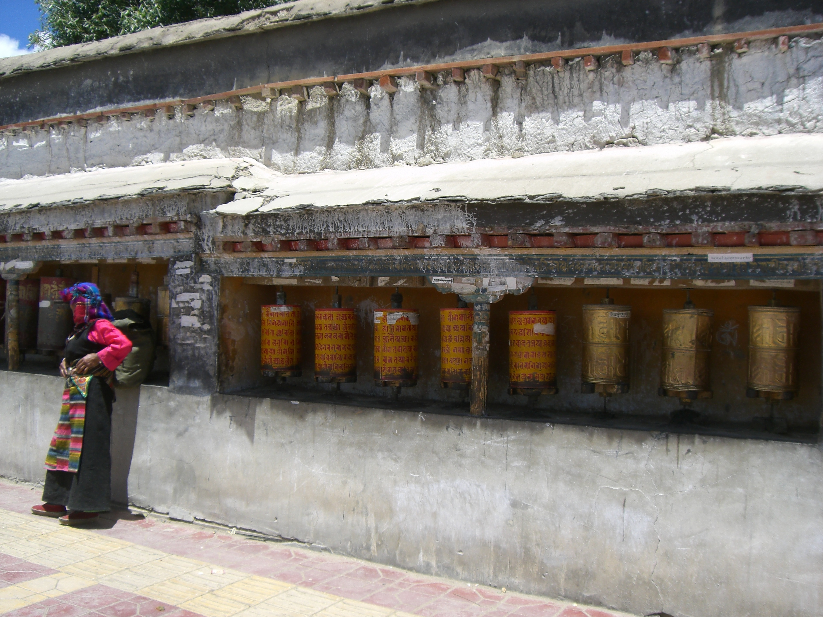 I walked out in the road and tried to see Everest and Cho Oyu — both were mostly obscured by clouds, but I could see their enormous landbases rise from the plateau floor. I studied the flat-roofed and square-windowed Tibetan structures around me. There was an organic, breathable design to these buildings. I wondered how they held up to the snows which pounded the region in the winter. I saw a bunch of pancake-sized yak chips stacked high upon one another as they baked in the sun. It then struck me that the yak in Tibet was what the buffalo was to the AmerIndian. It provided all the necessities of life — food, clothing, and shelter. Like the buffalo, the wild yak herds of yore are no more. Most yak today are hybrids. They have been crossbred with cattle, but a good chunk of Tibetans still pull most of what they need from these animals. After an hour or so in Tingri, it was time to get back in the Landcruisiers and continue to Lhatse. We made it there in the early evening. My head still ached, but I was more dehydrated than anything else. I went into the town and bought 2 of the largest water bottles I could find. That night I had the most vivid dreams. I saw trees with leaves flashing with multi-colored lights. Those had to be manifestations of the prayer flags I had seen in Lalunga earlier that day. I also retained fleeting dream images of elfish spirits or little demons darting from the trees. I had previously read about the pre-Buddhist, Tibetan folk religion of Bon which centered its practice around a multiplicity of gods and spirits of nature, so these concepts must have materialized in my head during that first night of sleep on the Tibetan plateau. When I woke up that next morning, I felt like my normal self save for some chapped lips. But, other than that, I felt like I had acclimated to the altitude and was ready to kick things in gear which was timely because we were now heading to the second largest city in Tibet, Xigatse (or Shigatse). I was ready to explore every inch of what we were going to see there — the Tashilumpo Monastery – Seat of the Panchen Lamas.