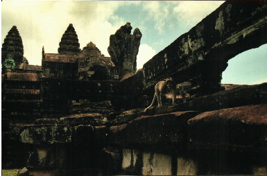 The Khmer Empire ultimately came to an end when the Thai Kingdom of Ayutthaya invaded and conquered Angkor in the 15th century. Thereafter, the inhabitants of Angkor began to leave, the creeping jungle slowly swallowed it up, and it became lost for centuries. But, what was not lost was Theravada Buddhism which had taken root after King Jayavarman VII’s death and became further entrenched as a result of the conquering Thai. Today, Theravada Buddhism is still the dominant religion of Cambodia notwithstanding the fact that the Khmer Rouge did their utmost to eradicate its practice. At the end of my first day at Angkor, I climbed up a hill called Phnom Bakheng which is located to the north of Angkor Wat. Many tourists and villagers go up to the top of this hill to watch the sunset and see how the fading sunlight changes the color of Angkor Wat which one can see below. From the hilltop, I was able to comprehend how enormous Angkor was and saw the boundaries and moats which the Khmer had so methodically engineered in order to protect and sustain its large population (ironically, one prevailing theory today as to why people ultimately abandoned the capital was that problems with proper irrigation for farming led to its collapse). I took several photos which captured the light dancing off Angkor Wat in all sorts of different shades. It was mesmerizing and I was rabid in anticipation of many more incredible scenes and photo ops that I would certainly experience over the next few days. Then, a funny thing happened. As I was pedaling on my bike and turning to exit the archaeological park which was closing, a small car with an attached food cart trailer came up on my left side. I tried to be sure that the car had a wide berth so it could pass me cleanly, but somehow my front wheel bumped a wheel on the trailer and I went flying over my handle bars. I don’t remember the pain of my fall. I only remember looking up and blinking at the face of someone staring down at me with concern. It was the driver of the car. He spoke a little English and asked me if I was OK. I stood up with a shakiness and tried to get my bearings. I saw the bent front frame of my bike a few meters away from me. I then looked down and saw my dented camera near my feet. I think somehow the impact of my fall was absorbed by my camera which I had strapped around my torso. I slowly wrapped my mind as to what had just happened and then I realized I was not seriously hurt. I exhaled in relief and looked at the man. I could only smile. He smiled back. I started to laugh and shake my head. I told him I was OK and shook his hand goodbye.