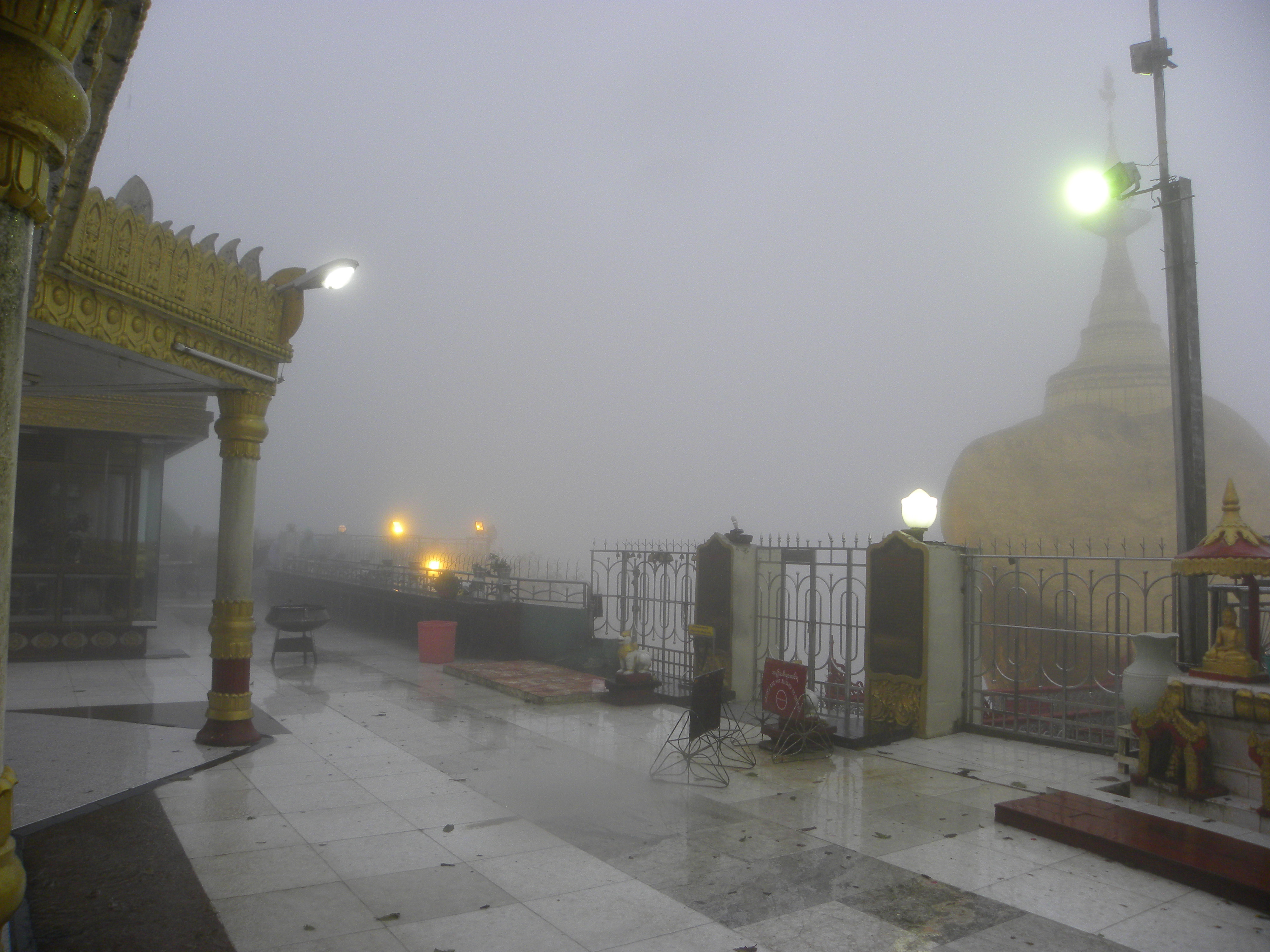 The grade was steep and although the path was wide and paved, I was basically going up a river. The rain had swallowed up the entire surface area and I was ankle-deep in a fast-moving current that had small whirlpools in areas. I tried to carefully pick out each of my steps hoping I could find some higher ground here and there. My sandals became dislodged from my feet a couple of times and I had to waste energy in backtracking as I chased them downstream and grabbed them before they were lost. Not another soul was around. I had an uneasy feeling because I really had no idea as to where I was heading. I was a man facing nature at its most unforgiving and I was just winging it. My umbrella was useless — it basically snapped at one point and I used it more for balance than anything else. There was no shelter — although there were sheds along the way which one could use during the pilgrimage season — these were all closed. After about 30 minutes or so, I felt my mouth drying out and I cursed at myself for leaving my bottle of water in my driver’s car. Ironic. Here I was with water all around and yet I thirst. I had no choice but to keep climbing up through the current. I stuck to each switchback with my head bowed and eyes focused on the next step. Then, I came to the fork in the road. I stood there for at least 10 minutes hoping someone would walk by and I could ask them which way led to the Golden Rock. But, there was no one around. I had this strange thought that popped in my head: I was so tired and dehydrated that I actually felt the desire to climb up a tree and rest there until the rains stopped. Then, from the vantage point of the tree I was sure to see the Golden Rock or some buildings that would be near it. It was like a hallucination — and I brought myself back to reality. The wind was whipping around and the rain was relentless. My body temperature was starting to drop as the rain penetrated into all of my pores. I had 2 choices — either go left or right. The fog bank was milky thick and visibility was non-existent. I chose to take the left path — it felt natural and aligned with the journey so far. It turned out to be the right choice — within 15 minutes I came to a large wooden gate. Relief. I walked through the gate and I could see the official entry building to the Golden Rock in front of me. The steps leading to my hotel were on my right. I went straight to the hotel — which was a small mountain top compound. At the front desk, I fished out my special case from inside my daypack. Inside this case was where I had stashed my passport and money. My hotel voucher was destroyed and my passport was wet around the edges, but the inside Myanmar visa page was intact. I handed the shriveled remnants of the voucher to the hotel clerk, who thankfully did not protest and gave me my room key and pointed out the direction to my room. It was close 2pm so I had little time to waste. I had no change of clothes other than one other t-shirt inside the daypack which was also wet. I dried out the best I could and then took 2 hotel towels and wrapped them around my legs and torso and then threw on my wet shorts and spare t-shirt on top. I layered myself with my windbreaker and poncho again I actually thought I had put together something waterproof. Silly thought.