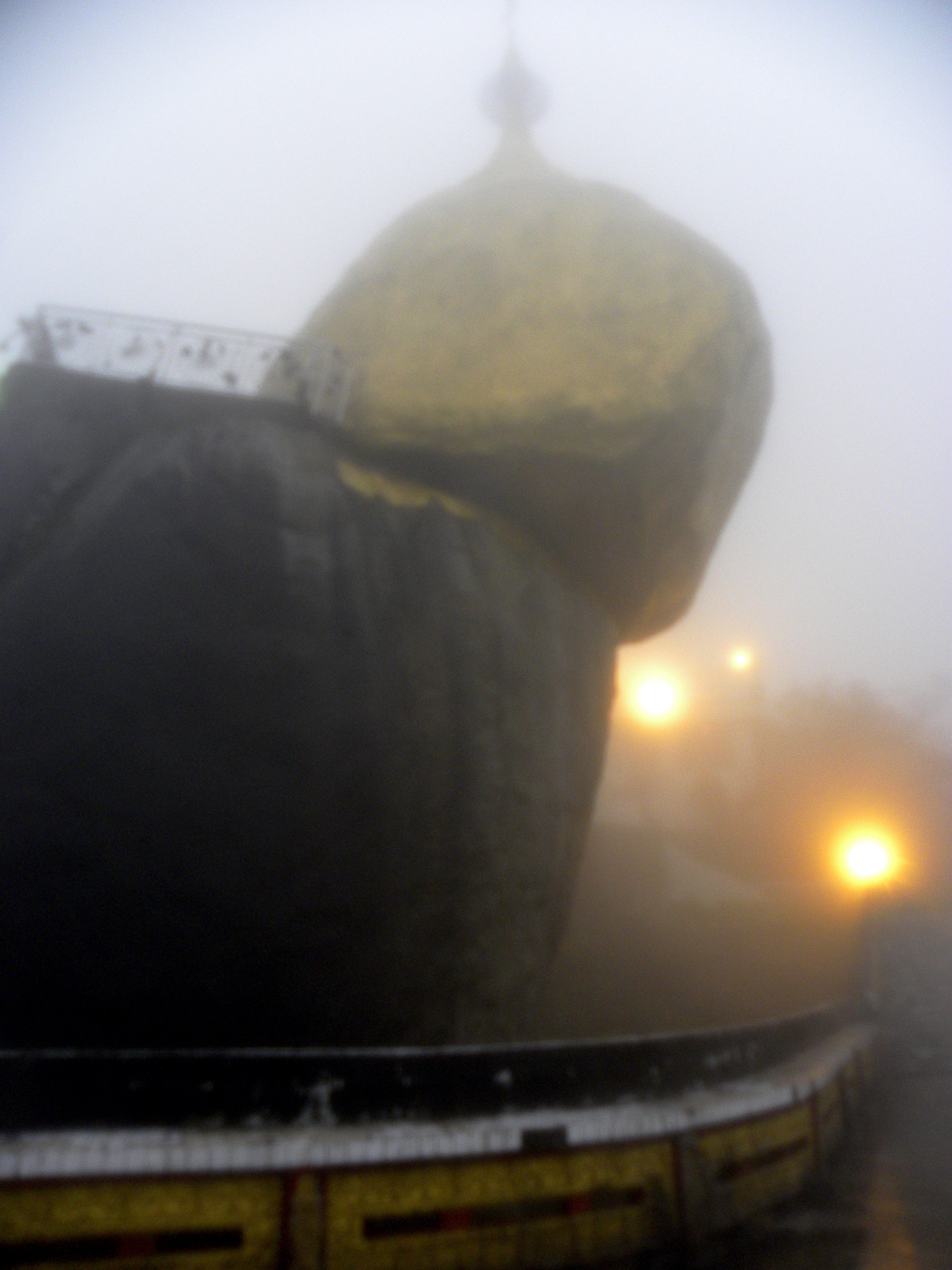 I went outside and the rain and wind instantly swallowed me. I bolted to the entry building where I paid my $5 entry fee to the Golden Rock and received a pass. I got to the first pair of Chinthes that were stationed in front of the passageway that led to the Golden Rock. I had to remove my shoes and walk barefoot from here on out. I could barely see, but I picked out 3 forms in front of me. They seemed like a sign. Barefoot and enveloped by the monsoon, I followed them. Off to my left side, I first saw the Kyaukthanban Pagoda or the “stone boat stupa” — which legend has it represents the ship that carried the Golden Rock from the sea and transported it to Mt. Kyaiktiyo in the 11th century. From there, I had to walk another 700 meters or so until I came a plaza are where there was a rectangular glass room and then beyond that was the actual viewing platform that surrounded the Golden Rock. It was floating in the mist like an orb. It was nearly impossible for me to aim my camera since the winds and driving rain were so strong. I despaired at the thought I would not be able to capture any image of the sight before me. I heard the clicking of the camera shutter, but all I saw was a watery blur in the viewfinder. Conditions and visibility continued to worsen as I encircled the Rock. I walked below it and came out on the right side.